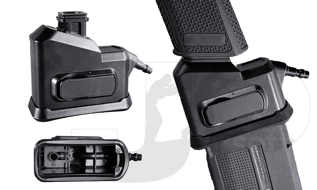 Injection-moulded adapter enabling EU-series pistols to use M4 AEG magazines with HPA systems.