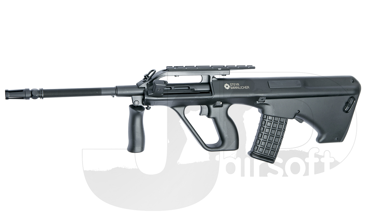 The A2 version of the Steyr AUG is the updated version of the AUG series (Armee Universal Gewehr) licensed by Steyr Mannlicher, Austria. On the A2 you get an accessory rail where you can mount your preferred aiming device.