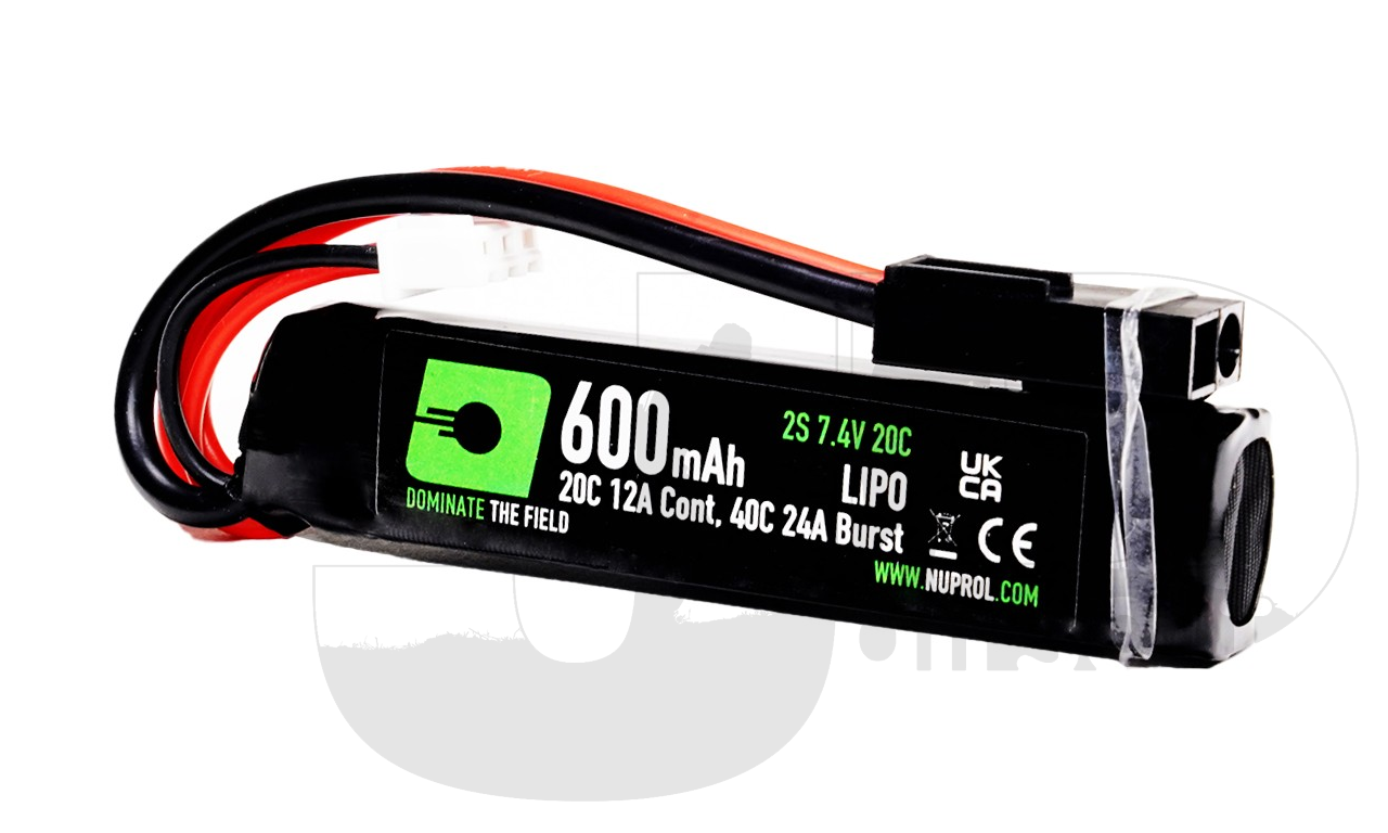 • STATS - LiPo | 7.4v | 600 mAh | 20C/40C @ 12A/24A (Cont/Burst) - Airsoft AEGs use the "Burst" flow rate to start the motor, and then the "Cont" flow rate to provide continuous discharge (check your owners manual to ensure the battery purchased meets the minimum flow rate (C) of your AEG) - this battery provides approximately 3 minutes of continuous discharge before running flat.