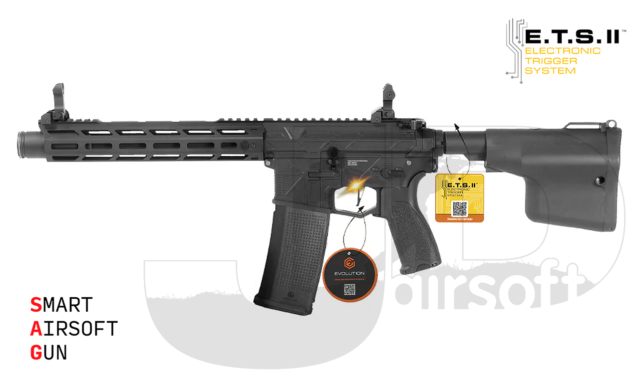 The Evolution Ghost M EMR A AX is a superb rifle that packs a lot of feature. Providing pre-upgraded AEGs with superb quality externals, giving Airsofter's what we always wanted; a gun we don't have to mess with! Though some live for the "thrill" of installing upgrades and hoping they work, for the rest of us, Evolution Airsoft has come through once again. The Smart Airsoft Gun series features the same impressive internals and rock solid externals as previous Carbontech AEGs, but with the new and improved ETS II installed. This AEG is the M version of the Ghost EMR, optimised for CQB and aggressive playstyles with the AX stock installed for a stubby, aggressive aesthetic!