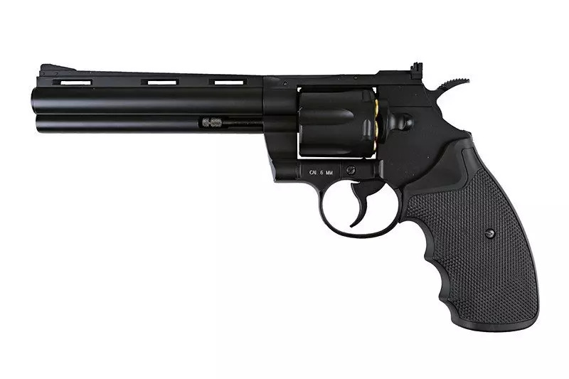 A 6” .357 revolver replica by KWC was made from durable polymer and metal. The body, cylinder, hammer and barrel are made from metal, the pistol grip and shells are made from polymer. Th replica is powered by CO2 capsule and first shots may give the pellet velocity of ~520 FPS, but on following shots the muzzle velocity stabilizes on ~500 FPS. This revolver comes with cylinder for 6 shells into which the 6mm bb's are fit.