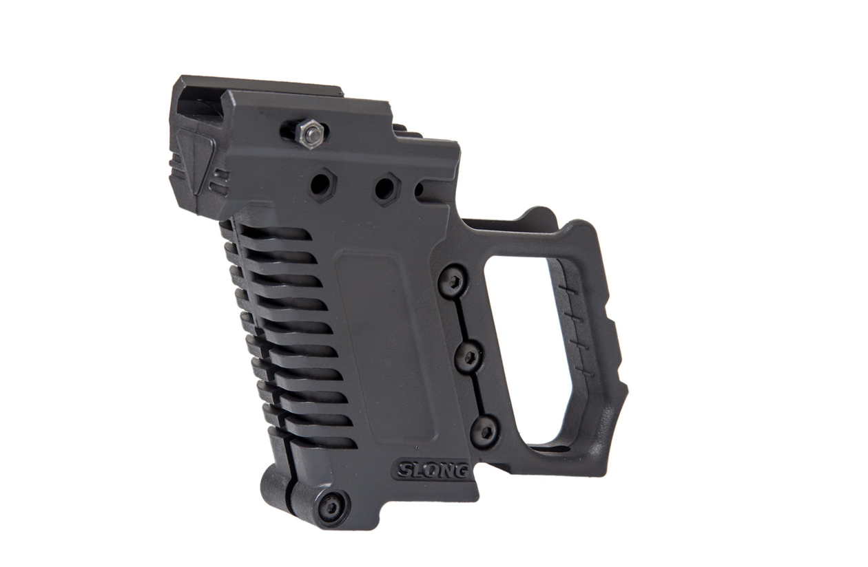 Converts your pistol to Carbine, holding spare magazine in the front and providing a superior firing platform by allowing both hands to hold the weapon platform firmly.