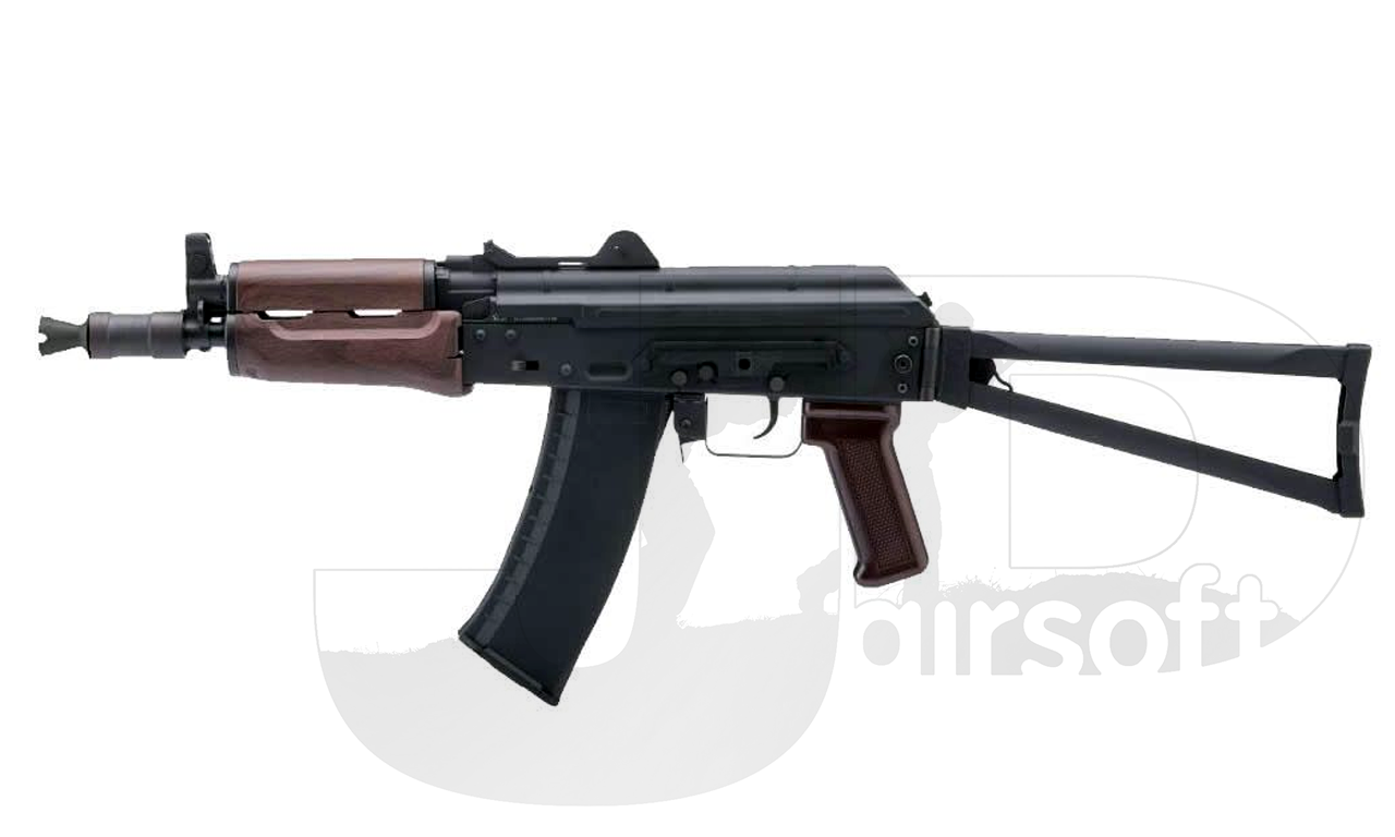 The KWA AKG-74SU is a gas blowback AK style rifle that was designed to accurately simulate the AK platform. It features a full metal alloy receiver and high impact polymer hand guards, pistol grip, and full folding stock. An AK side rail mount on the receiver allows users to expand their platform with AK specific mounts and accessories. Realistic construction means that the rifle functions and operates identically to its real firearm counterpart. The blank-fire mode built into the AKG-74 magazine, allows the user to train safely without chambering a round. Powered by the KWA Force Velocity engine, the KWA AKG-74SU is a strong reliable rifle for those interested in training with the AK platform.