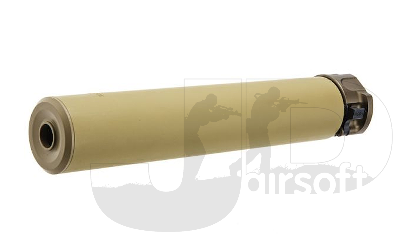 The GK Tactical SOCOM suppressor is a mock suppressor designed to replicate a 5.56 caliber suppressor.  The suppressor attaches on top of the flash hider and can easily be detached.