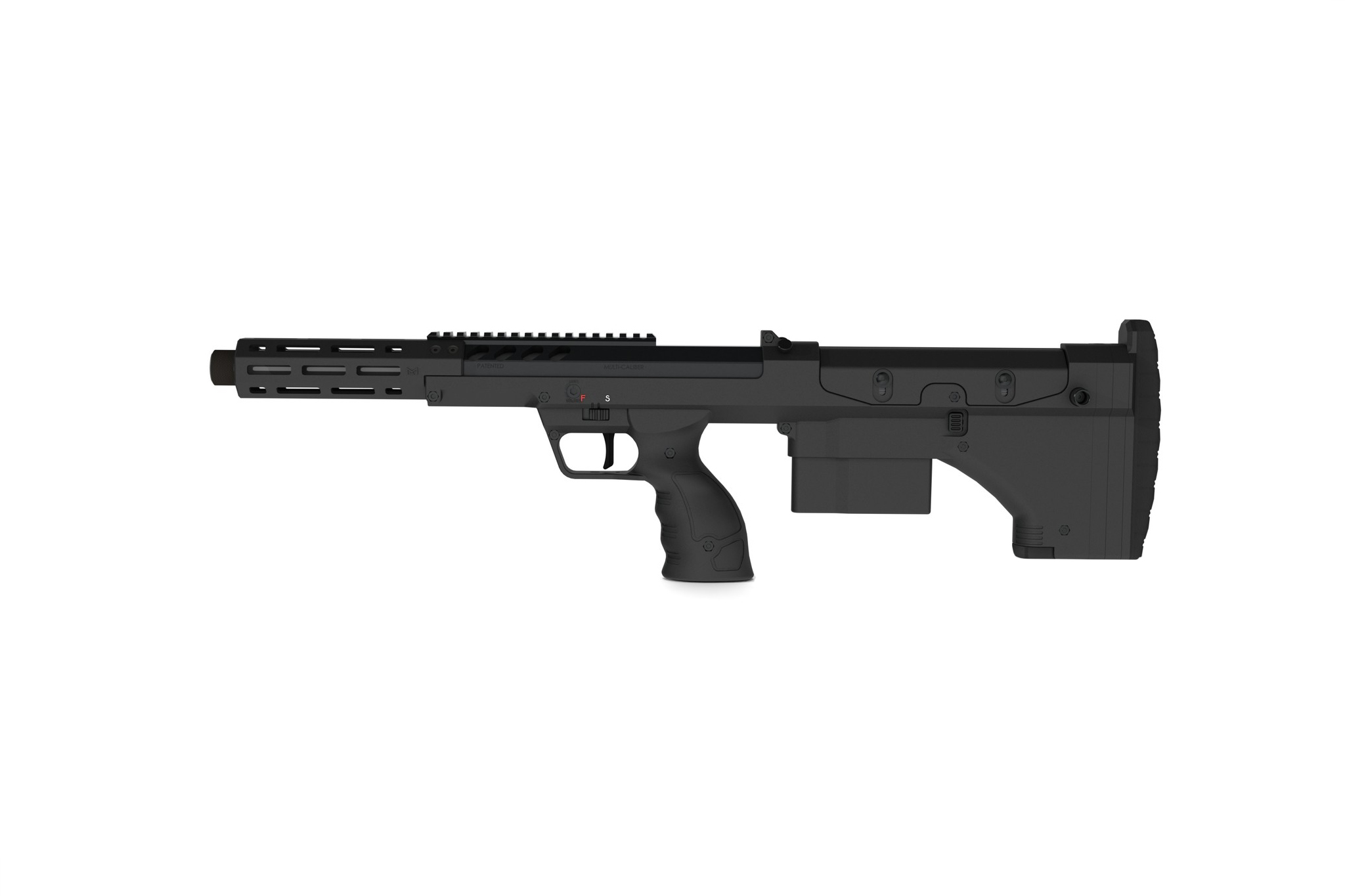 The SRS monolithic receiver, made of aeronautical grade aluminium, by CNC, features the new patented barrel mount by Desert Tech, that more uniformly clamps onto the barrel and reduces peak stress points. SRS-A2 receivers are highly lightened, participating actively to the mass reduction. Each receiver has a unique engraved serial number. The lightweight fiber glass reinforced handguard is using MLOK attachment system. SRS A2 receiver features a stainless-steel attachment point for tripod (1/4-20 UNC thread). SRS A2 receiver is compatible with the replica of the Desert Tech monopod (patented). Top rail is detachable , allowing use of multiple optional alternatives, including M2 type rails.