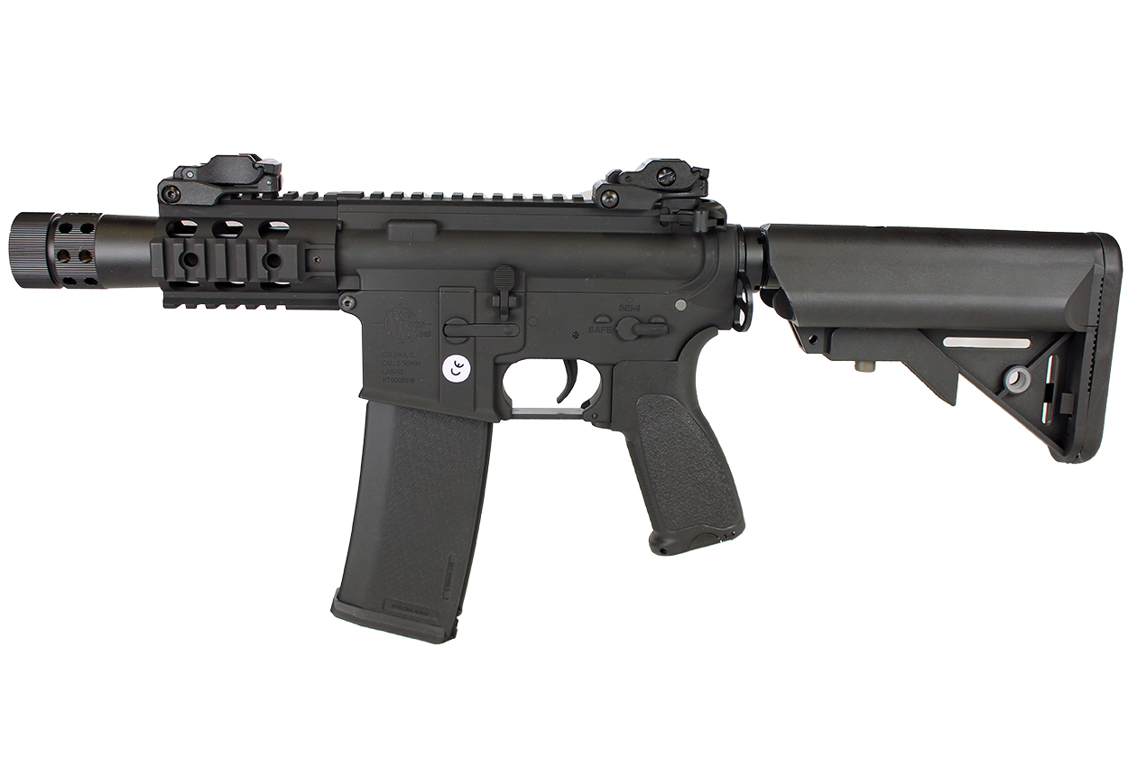 The SA-E10 carbine replica is equipped with a short front in the 22mm RIS standard that allows the installation of a variety of accessories - grips, flashlights, laser pointers or optical sights. The replica barrel is finished with a muzzle device mounted on a 14mm CCW thread . Folding sights were placed on the dorsal RIS rail .