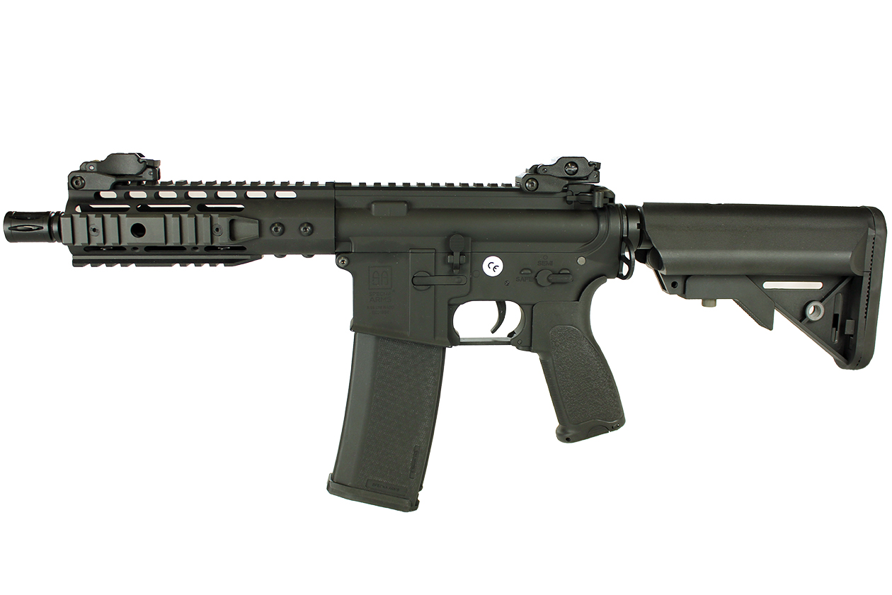 SA-E12 carbine replica is equipped with a free-float handguard in RIS 22 mm mounting system that can serve as a mount for various tactical accessories: flashlights, grips, laser sights and optical sights. The top of the replica features foldable iron sights.