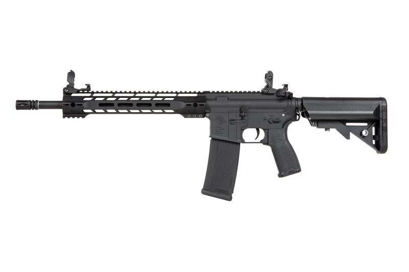 SA-E14 carbine replica is equipped with an M-LOK handguard. A short RIS mounting rail is located under the barrel. The barrel features a standard muzzle device on a 14 mm CCW thread. The top of the replica features flip-up iron sights. The sides feature QD tactical sling swivels.