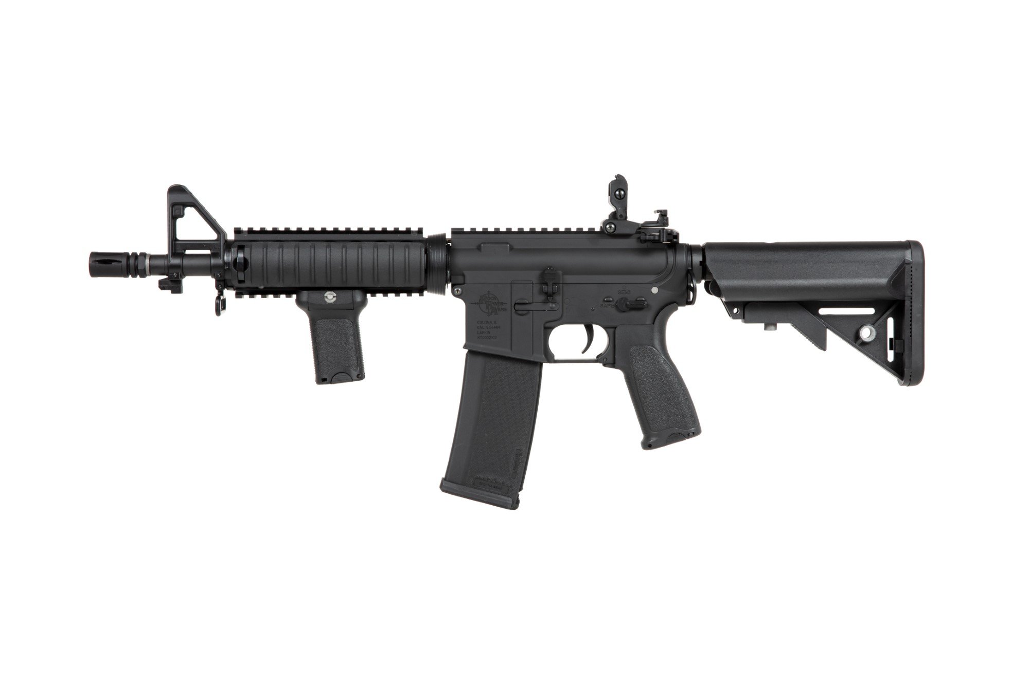 SA-E04 carbine replica is equipped with classic, short handguard in RIS 22 mm mounting system that can serve as a mount for various tactical accessories: flashlights, grips, laser sights and optical sights. The barrel features a muzzle device on a 14 mm CCW thread. The top RIS rail features flip-up iron sights.