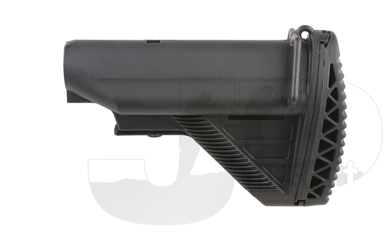 A telescopic stock with adjustable length made from strong polymer intended for attachment in M4 type replicas. The stock features a comfortable stock pad made from hard rubber that also serves as a cover for the inside of the stock that contains 2 longitudinal slots for 4 batteries.