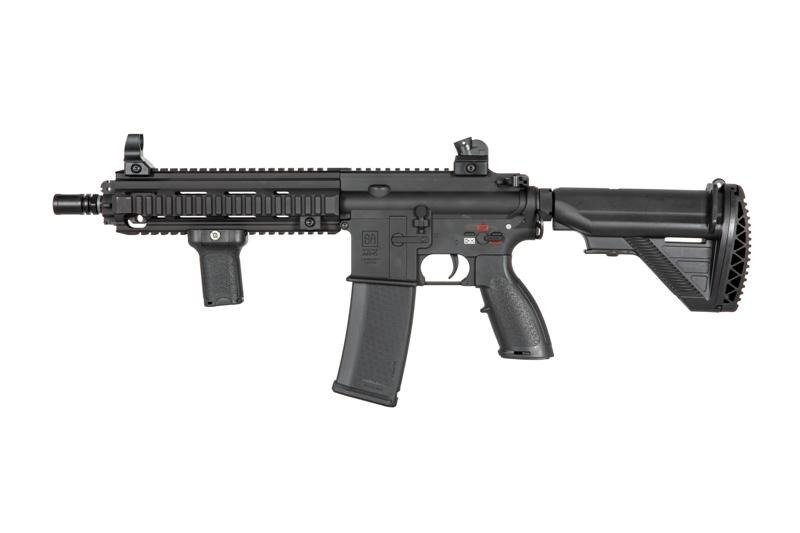 SA-H20 EDGE 2.0™ carbine replica is equipped with a front rail in RIS 22 mm mounting system. The barrel features a standard muzzle device on a 14 mm CCW thread. The top of the replica features flip-up iron sights with an adjustable, drum front sight.