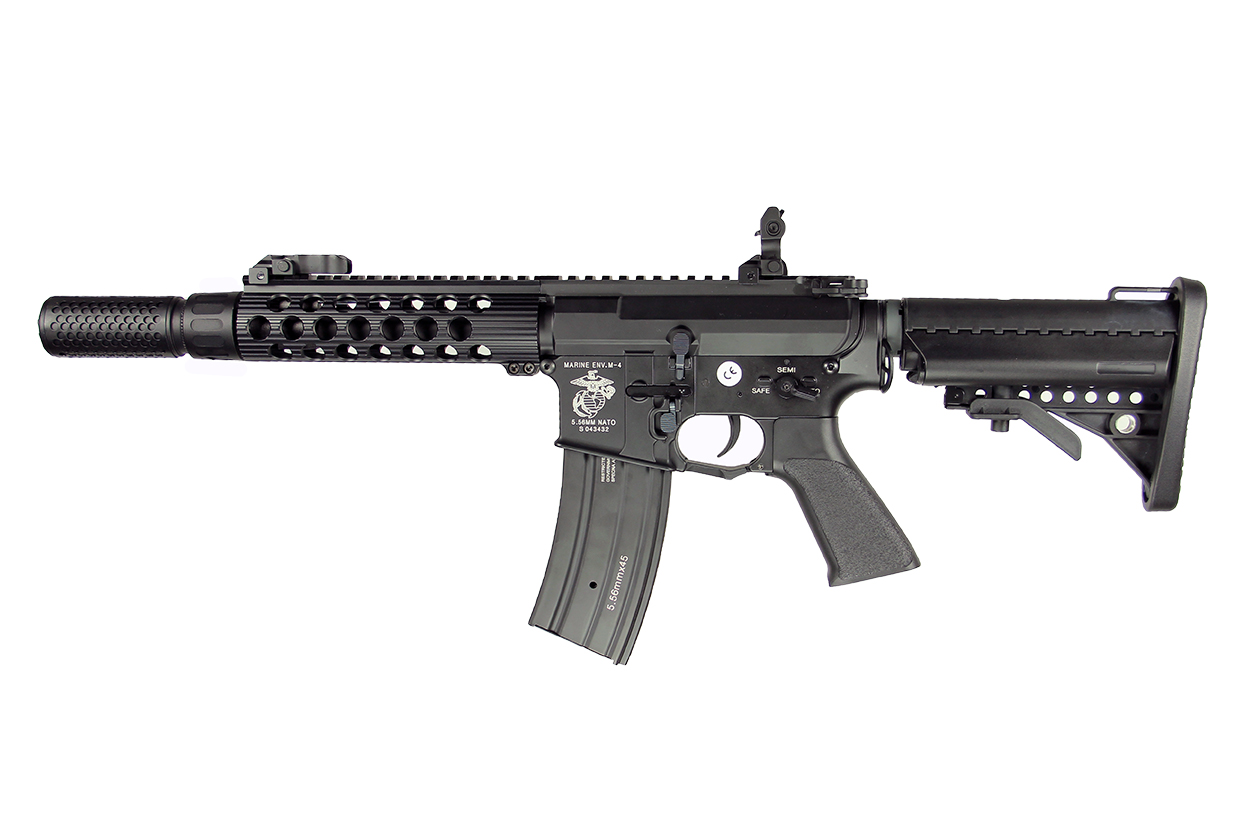 The replica is equipped with a 22 mm top RIS rail, Free Float handguard and an adjustable stock. The top RIS rail features metal flip-up iron sights, which can be freely detached in order to make room for the attachment of a chosen optoelectronic aiming device. Due to the extendable stock with an anti-slip stock pad it is possible to adapt the replica’s length to the body type and preferences of the user. Standard flash hider is based on 14 mm left-handed thread, which allows the attachment of a silencer in its place. What’s more, the set includes a silencer with a QD mount ideally fit for the handguard of the replica.