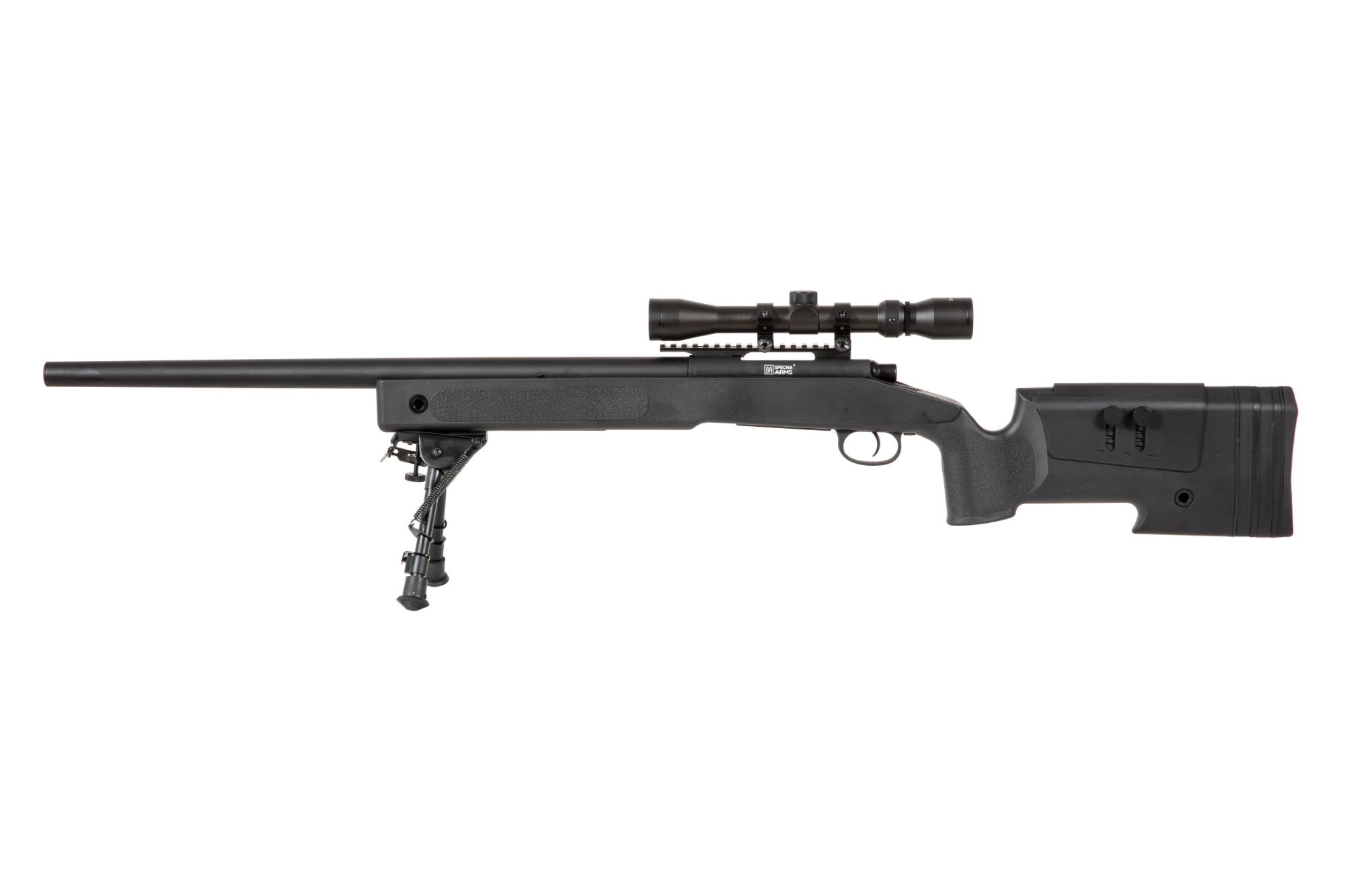 Specna Arms sniper rifle replica features a simple and reliable bolt-action mechanism, which means the replica needs to be reloaded before firing. The replica is made of metal and reinforced polymer. Parts made of metal include the entire set of the external barrel along with the chamber, trigger and charging handle as well as RIS accessory rails and all assembly elements such as screws. The chassis with the stock, stock pad and the magazine were made of solid polymer. The stock pad features a comfortable, rubber pad, whose thickness can be adjusted using a set of exchangeable overlays. In combination with the adjustable cheek pad it enables adjusting the stock to user preferences.