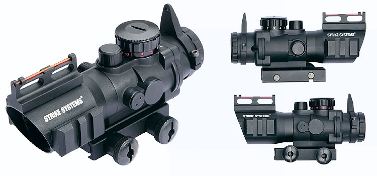 Already registered? Log in for updateThis Strike Systems Pro Optics scope has a T-shaped crosshair with a choice of red/green illumination. The intensity of the red/green illuminated crosshair can easily be adjusted to 5 different levels. The scope has a 4x32 magnification and features a fixed red fiber sight for close quarters aiming. Both sides of the scope has weaver rails for mounting accessories like flashlight or laser. The scope has integrated picatinny/weaver rail mount.