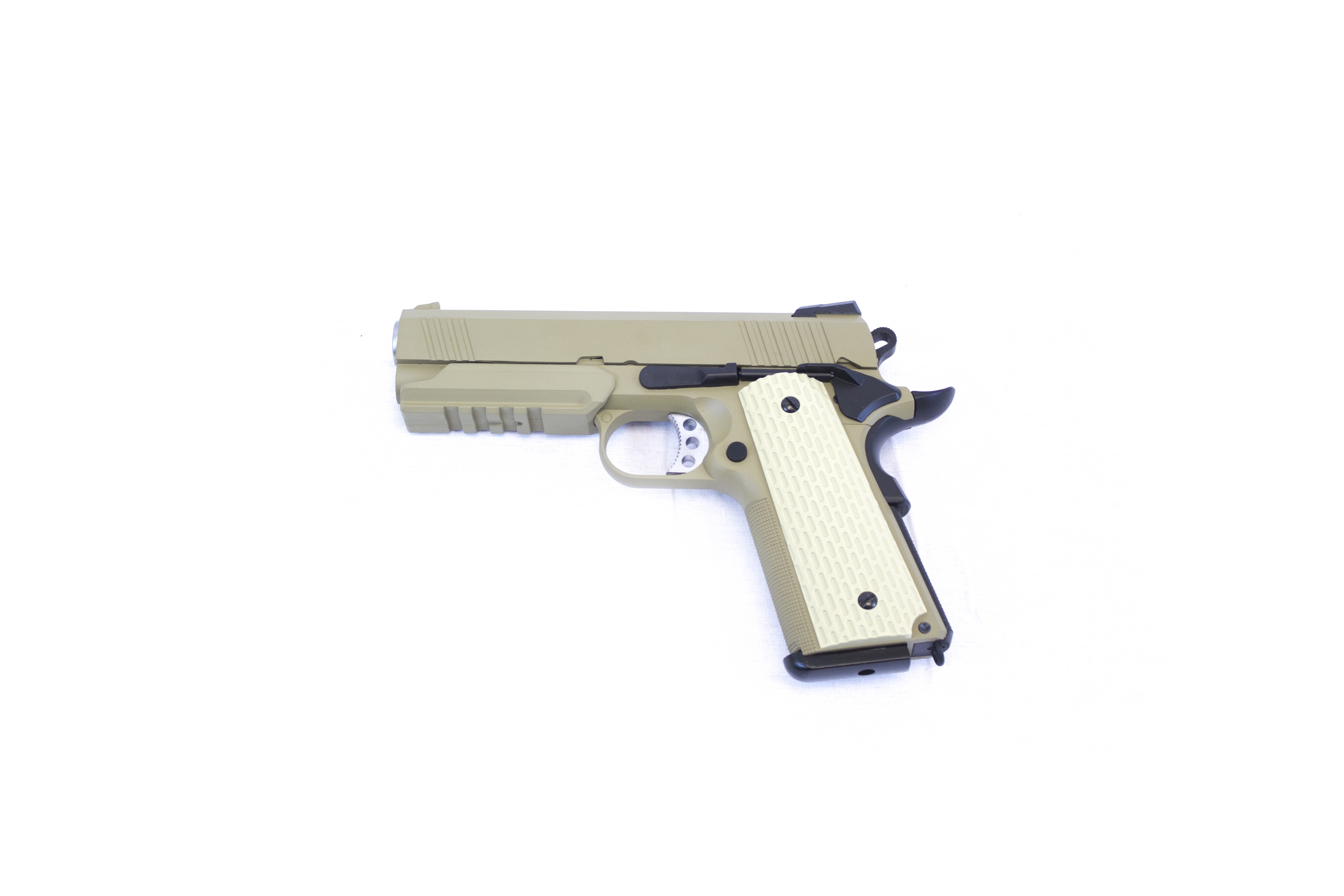 Already registered? Log in for updateThe WE 4.3 Desert Warrior has a metal slide, a metal frame, and a textured polymer grip. It is essentially a short single stacked 1911; the breakdown and the operation remain the same. The functional grip safety and ambidextrous slide safety make its operation safe for all users. The blow back action is operated by high pressure gas, such as green gas, red gas, or propane. The rail beneath the barrel on the frame is used for mounting accessories like the G&P M3 Pistol Flashlight. The reinforced metal parts include outer barrel, chamber, recoil spring rod, slide stop, safety, hammer, and trigger. The internal upgrade parts include reinforced recoil spring, hammer spring, firing pin, extreme high flow valve. This airsoft gun has the well established operation of the 1911 with the advantages of the under barrel rail.