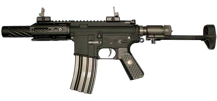 Comes with an aluminum made R5C Rail Hand guard and folding iron sights.